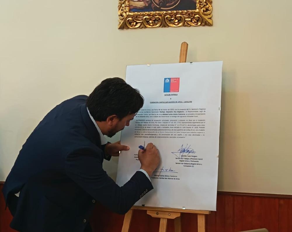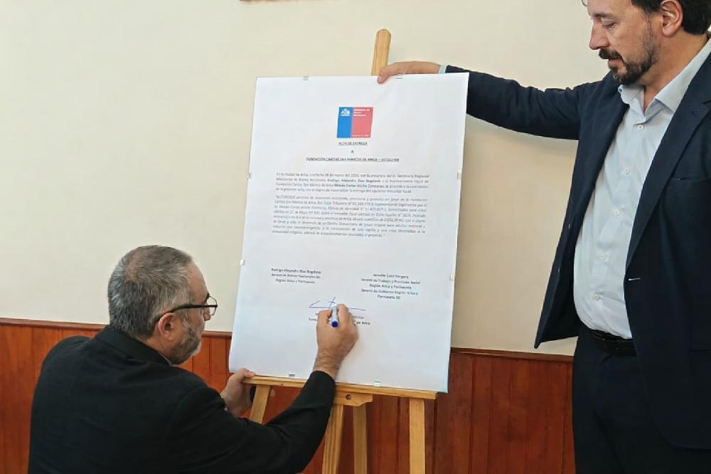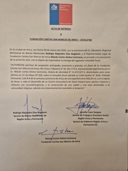 El acuerdo suscrito entre la Secretaría Regional Ministerial de Bienes Nacionales, la Seremi de Trabajo y Previsión Social y la Fundación Caritas San Marcos de Arica, representada por Monseñor Moisés Atisha Contreras, permitirá la entrega en uso de un terreno fiscal en Arica, dando inicio a un proyecto orientado a la creación de un Centro Comunitario de Salud Integral y espacios de encuentro al servicio de la comunidad.